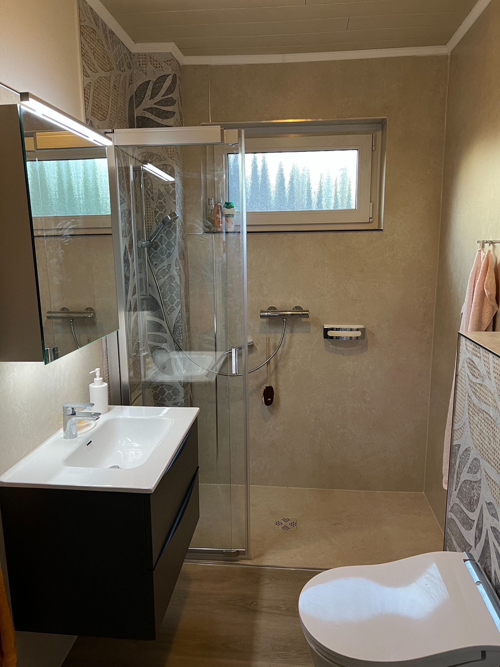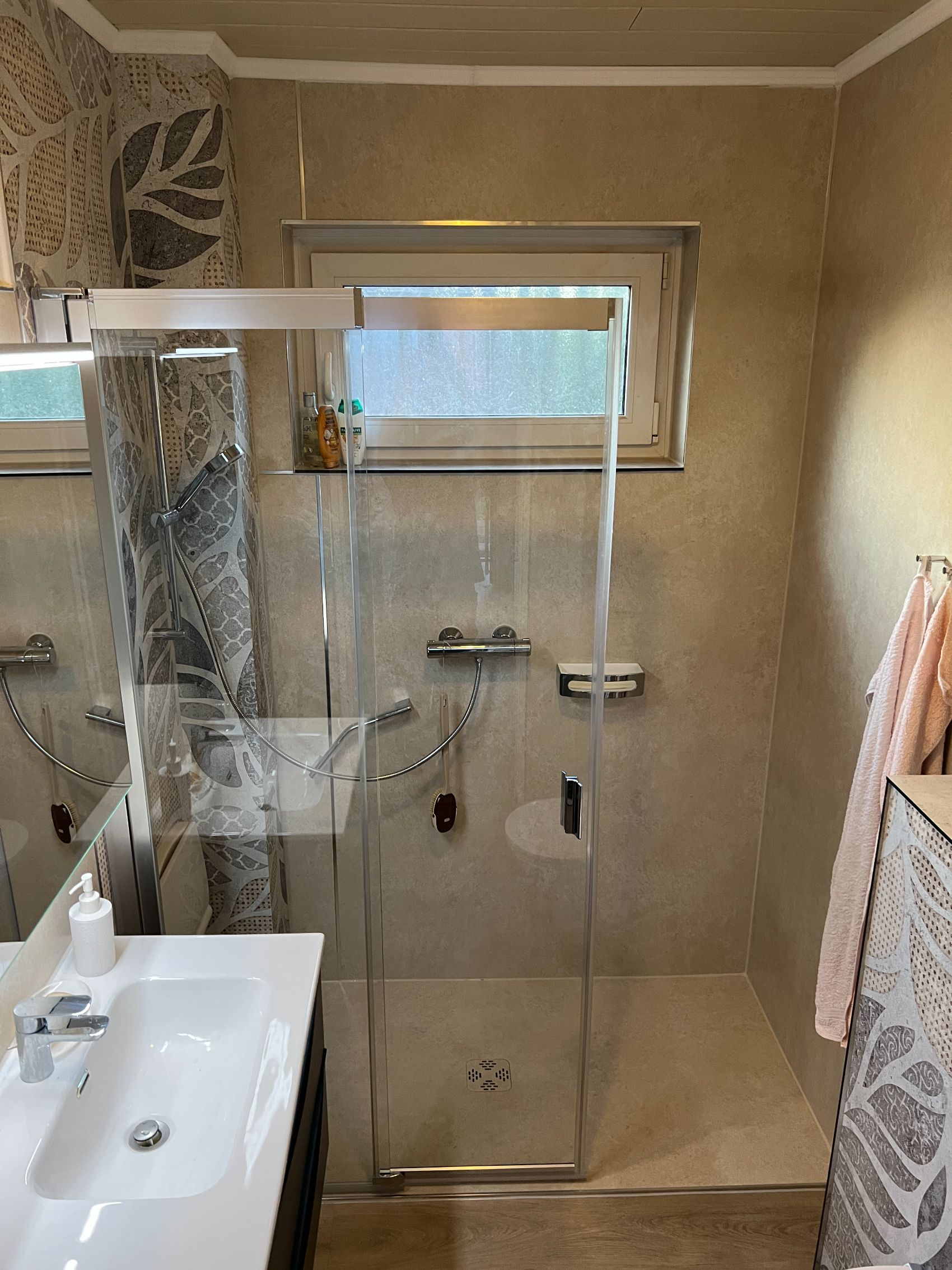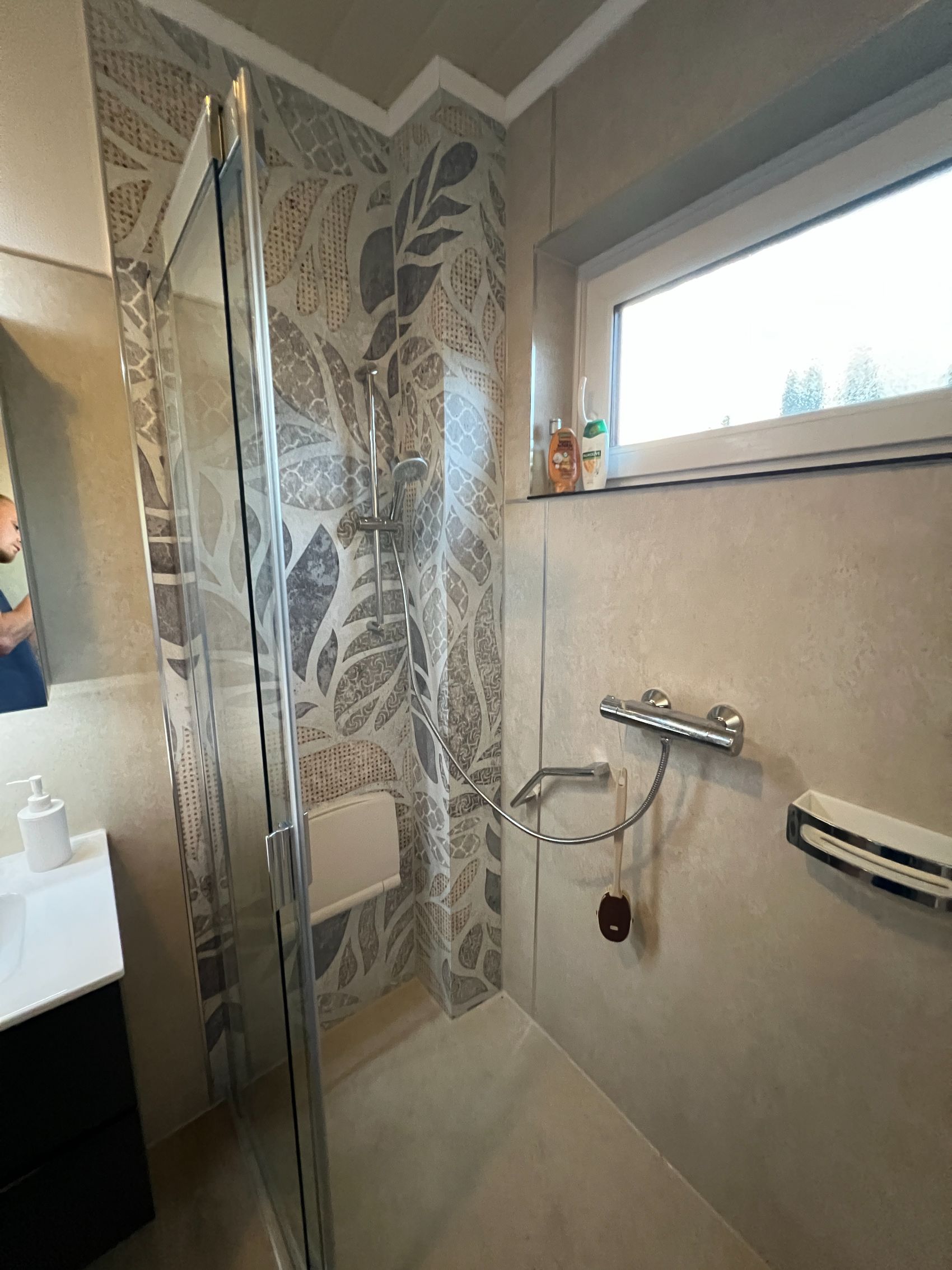 In Trittau wurde dieses Badezimmer für eine ältere Dame umfassend und altersgerecht modernisiert, wobei Sicherheit und Komfort im Fokus standen. Das Herzstück des Umbaus ist die großzügige, fugenlose Dusche mit einer rutschhemmenden Oberfläche der Klasse R11, die maximale Standfestigkeit garantiert. Ausgestattet mit einer komfortablen Schiebe-Drehtür aus Echtglas der Marke Duschking, ermöglicht die Anlage einen barrierearmen Zugang und verbindet höchste Funktionalität mit einer eleganten Optik.