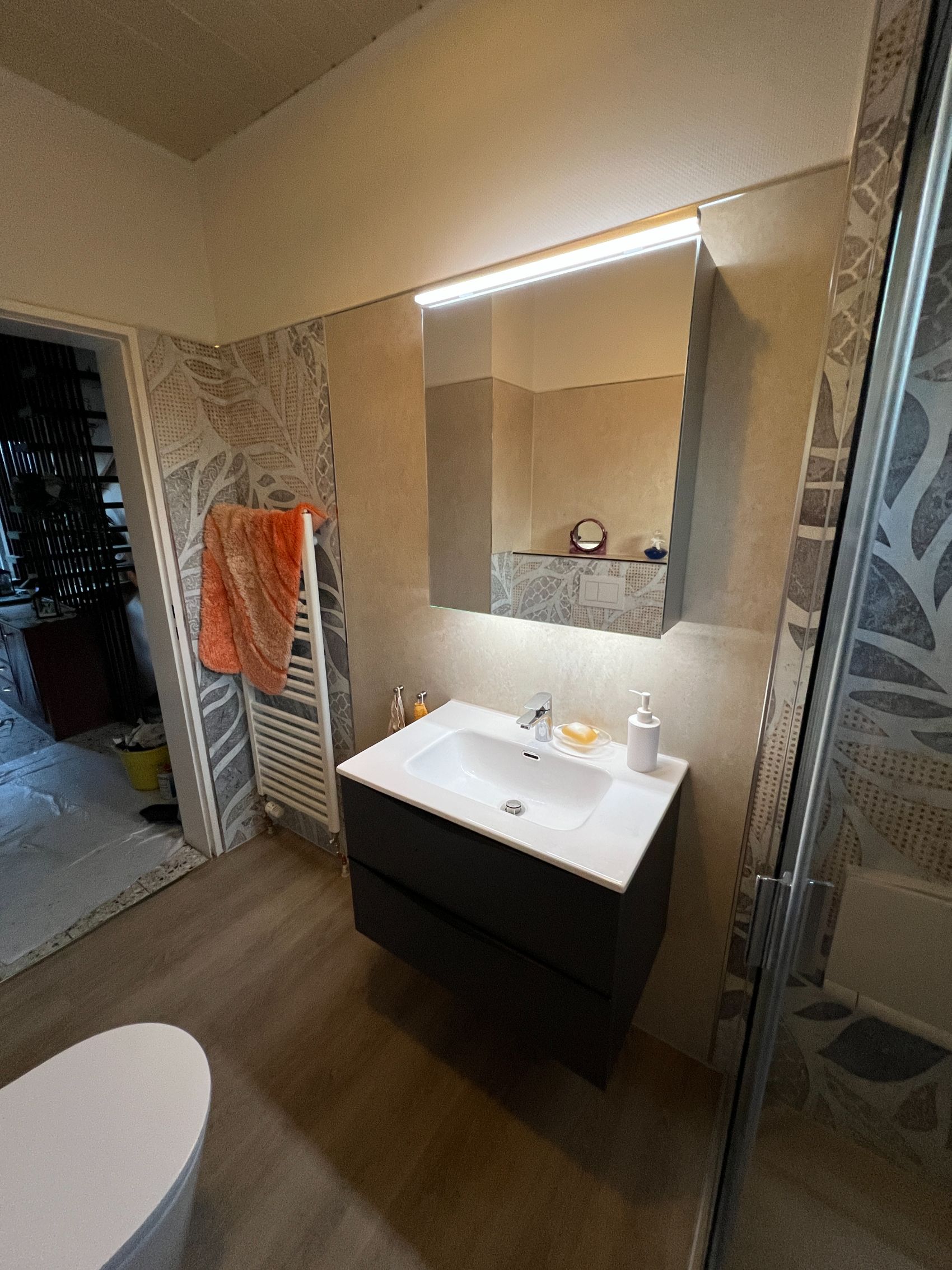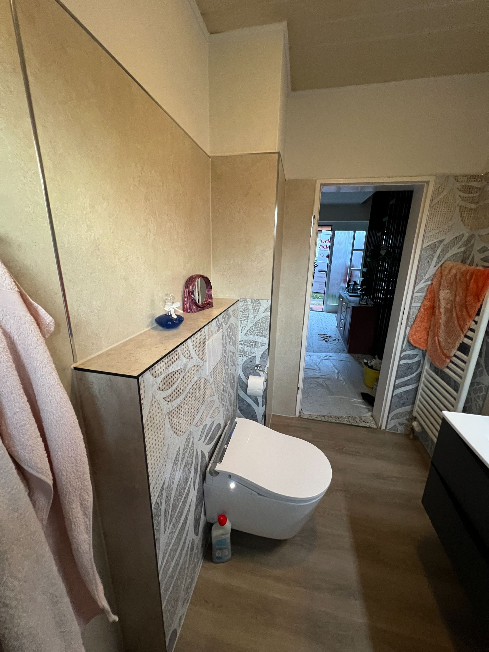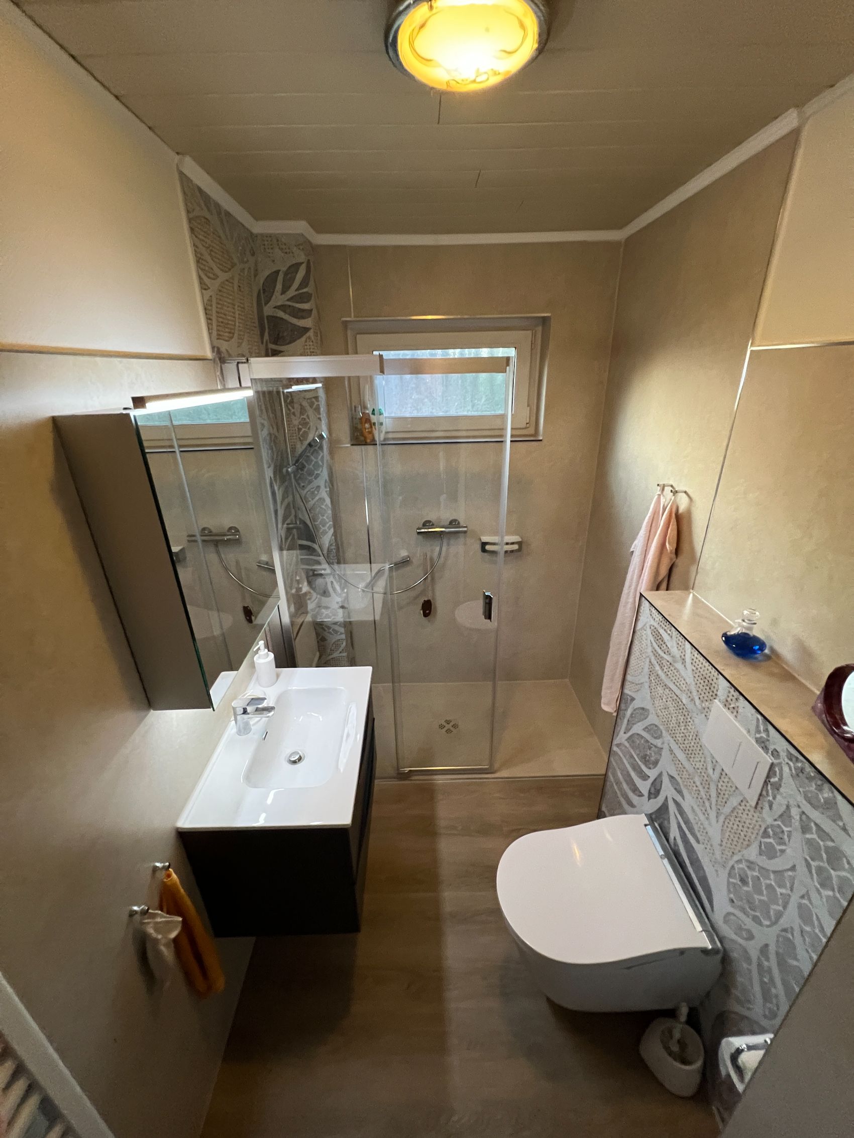 Die technische Ausstattung setzt neue Maßstäbe in der täglichen Hygiene durch ein modernes Dusch-WC von Duravit, das über eine Sitzheizung, eine Warmwasser-Dusche, einen Föhn sowie eine automatische Selbstreinigungsfunktion verfügt. Dank innovativer Modultechnik konnte das WC inklusive praktischer Ablagen innerhalb von nur einem Tag installiert werden. Das gesamte Gestaltungskonzept basiert auf der fugenlosen Wandveredelung und einem hochwertigen Design-Belag von Duschking, was den Raum nicht nur optisch vergrößert, sondern ihn zudem besonders pflegeleicht und zukunftssicher macht.